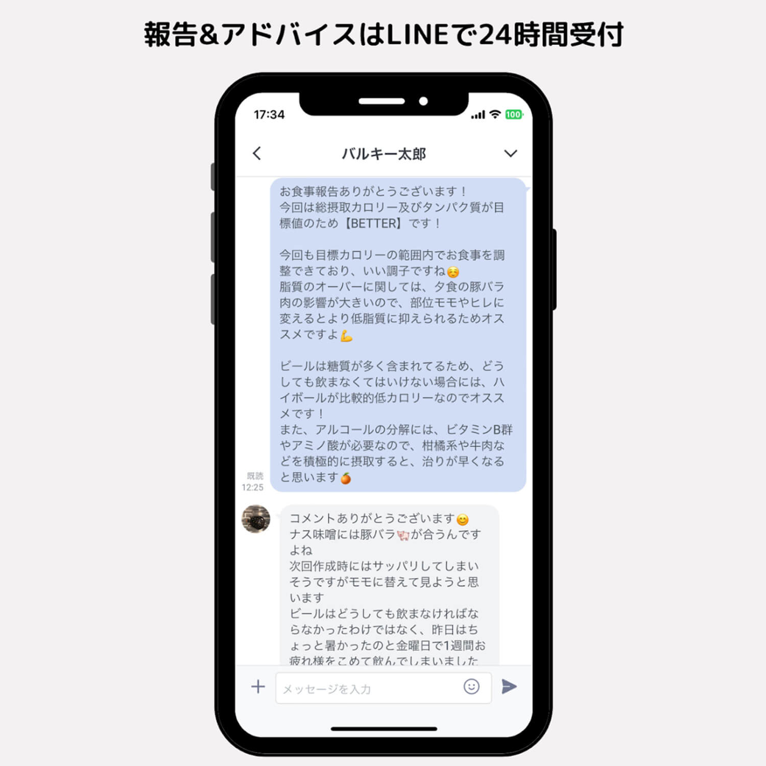 食事の報告や相談は24時間受け付けていますので、質問や不安なことがあれば遠慮せずに聞いてください。百戦錬磨のトレーナーがベストな提案を致します!