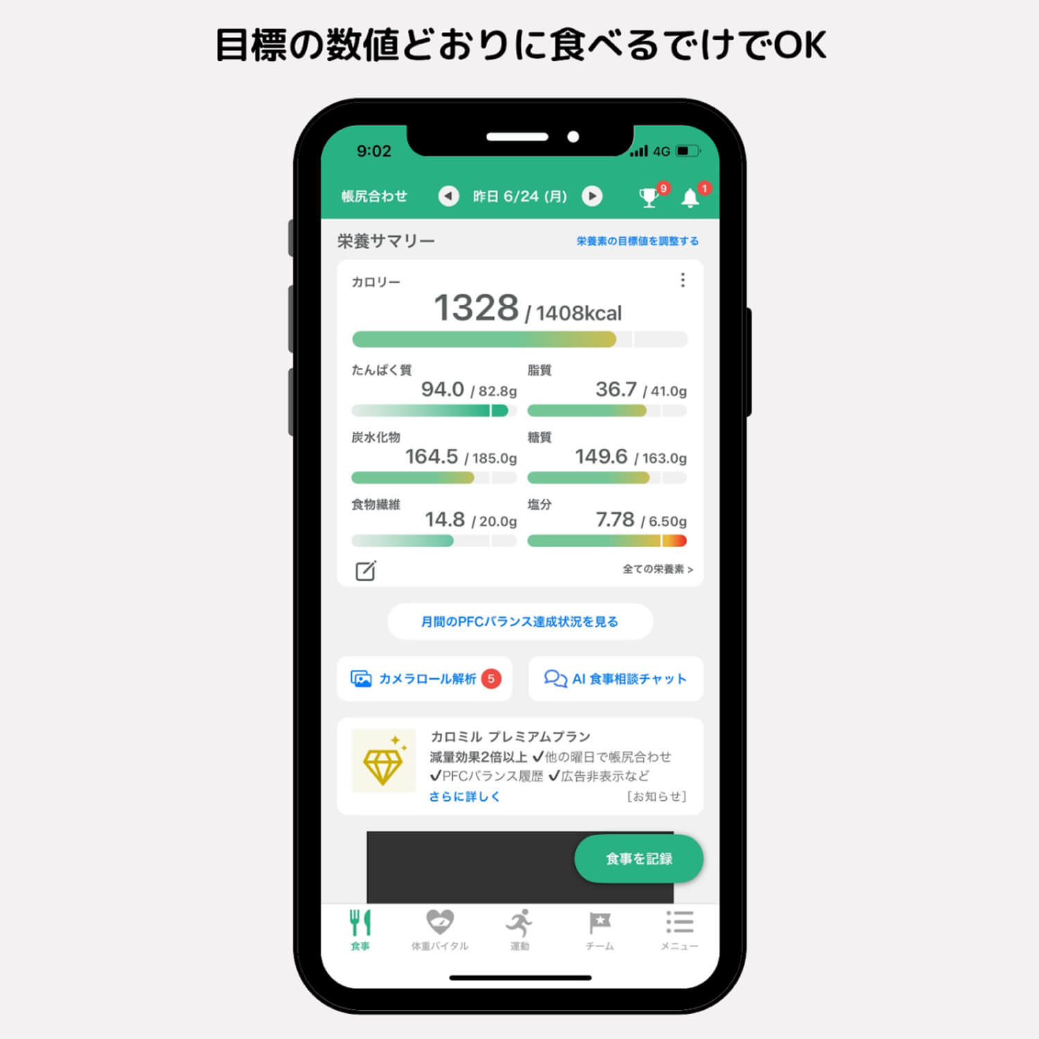 アプリ上のゲージ(目標値)にピッタリ合わせるようにゲーム感覚で食事管理を楽しみましょう!